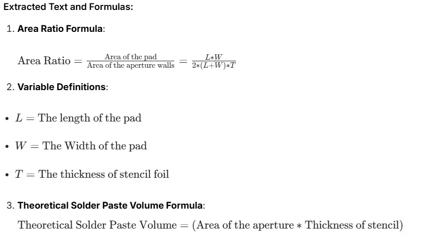 The image includes a formula for calculating stencil thickness, though the specific variables are not fully detailed in the text. Generally, stencil thickness is determined based on the finest pitch components and the required solder paste volume, ensuring the aspect ratio and area ratio guidelines are met for reliable solder paste release.