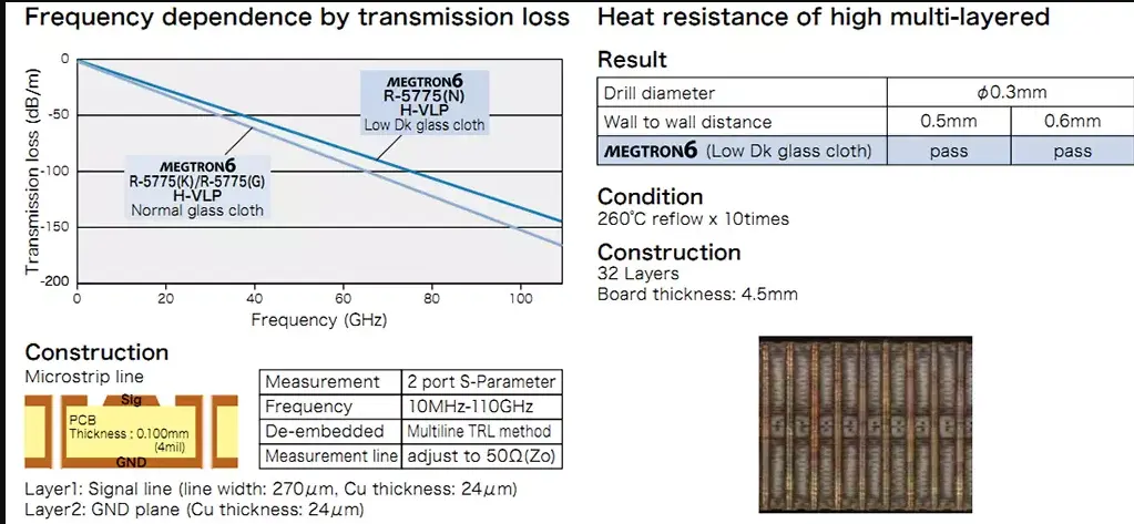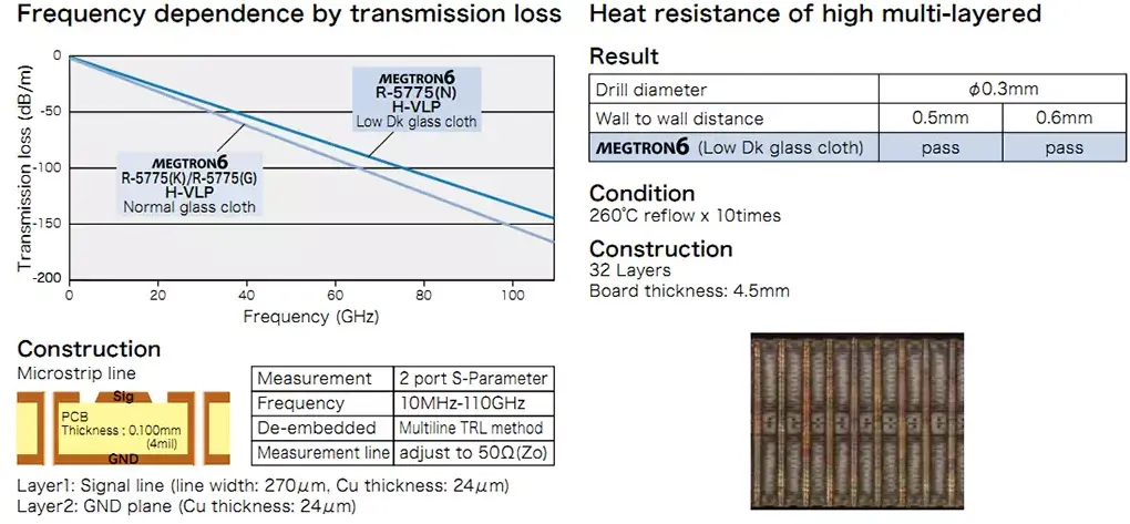 The MEGTRON6 R-5775 variant employs polyphenylene ether (PPE) as its base resin, providing a low dielectric constant and minimal dissipation factor (Dk=3.34, Df=0.002 at 1GHz). Combined with high-frequency very-low profile copper foil (H-VLP), the material achieves transmission loss levels comparable to PTFE-based substrates.